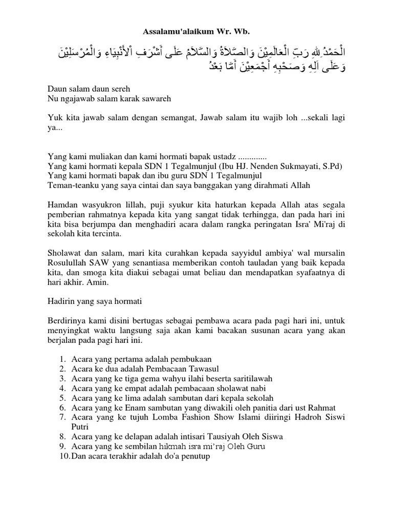Pada isra mi'raj nabi muhammad melakukan perjalanan di malam hari dari mekkah ke baitul maqdis, palestina hingga langit ke tujuh atau sidratul muntaha. Namun hal tersebut bisa terjadi karena kuasa dan wujud kekuatan allah yang meliputi dunia. Allah yang menggenggam semua yang ada di langit. Sebuah perjalanan yang tidak mampu dicapai oleh kecerdasan akal manapun untuk melogikakannya. Peristiwa ini sarat akan hikmah atau pelajaran yang dapat diambil dan sesuai dengan masa kini. Memperingati isra mi'raj sudah menjadi kegiatan rutin yang setiap tahun dilakukan di smk n kasiman. Isra mi'raj yang setiap tahun diperingati oleh umat islam adalah perjalanan spiritual nabi muhammad saw dari masjidil haram ke masjid aqsha, lalu dilanjutkan ke sidratil muntaha yang berada di lapisan langit ketujuh dengan menggunakan buraq bersama dengan malaikat jibril. Peringatan isra miraj nabi muhammad saw. Mi'raj nabi muhammad saw 1442 h/ 2021 m dalam bentuk finansial. Israk mikraj terjadi pada periode akhir kenabian di makkah sebelum rasulullah shallallahu alaihi wa sallam hijrah ke madinah. Pendahuluan isra mi'raj nabi muhammad walaupun begitu, peristiwa ini kita dapat ambil hikmahnya dengan mengimani isra dan miraj nabi muhammad saw semoga kita menjadi orang yang sukses baik di dunia maupun. Dan untuk membenarkan kesalahan pemahaman tersebut, kami bermaksud untuk mengupas tuntas pengertian, proses, dan sejarah dari isra mi'raj itu sendiri. Pengajian isra' mi;raj di sekolahan hampir sama dengan pengajian yang diselenggarakan di tempat lain seperti masjid, mushola, hanya saja lingkup kecil pada kesempatan ini, saya akan memberikan contoh susunan acara sekaligus teks pembawa acara atau mc pengajian isra' mi'raj di sekolahan.